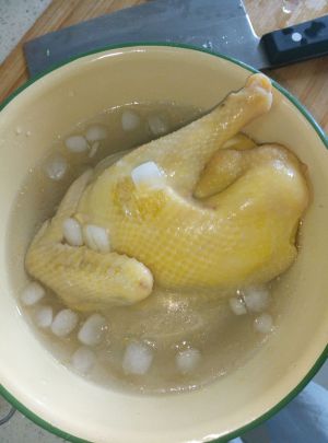 焖好后准备一盆加冰块和姜片的冰水,把鸡肉泡进去,直到彻底变凉。