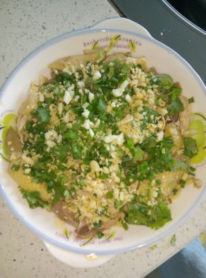 刚刚的鸡肉上码上少许蒜,芫荽,松子,小葱末