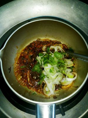 再加入少许香菜,葱白,搅拌后加入刚刚煮鸡的鸡汤,继续加热搅拌做调味酱料