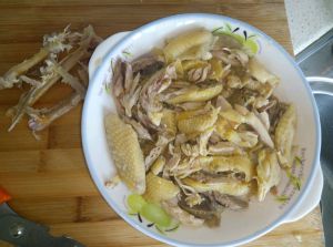 鸡肉捞出后立即放到冰水中,LZ上班之前把纯净水放在冰箱冰了一早上,冰水让鸡肉收缩得爽脆。
