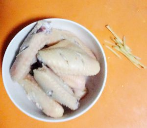 姜片切丝,鸡翅洗好后正反面各斜切两刀方便入味,烧一锅开水将鸡翅焯一下