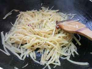 将土豆丝加入,加入酱油和适量盐大火翻炒,