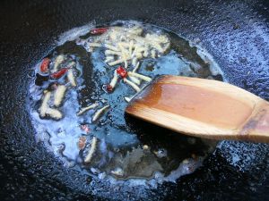 锅内热油,加入花椒,辣椒,姜丝炒香