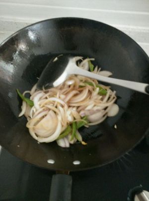 把生姜切丝与青椒洋葱一起入锅,翻炒均匀后加适量十三香,海天酱油。