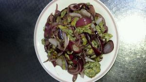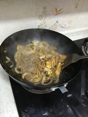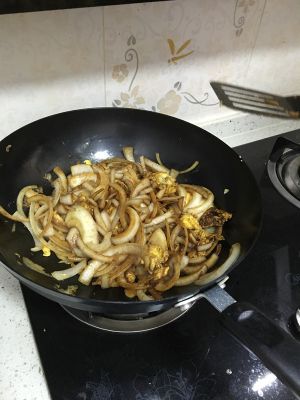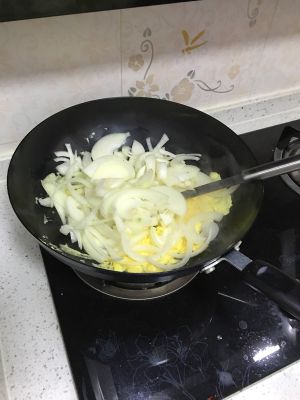 热锅再加稍许油,倒入洋葱炒熟,若锅太热,可加半碗不到的水继续炒,防止炒糊。