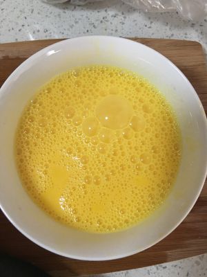 鸡蛋打碎,搅拌均匀,加料酒(可让鸡蛋变松软)。
