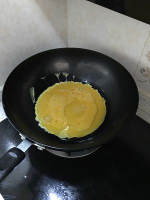 鸡蛋打散,平底锅中放一勺油,鸡蛋液倒进去摊成鸡蛋饼,蛋液凝固了翻面关火用余温煎另一面就行。边煎边用木铲把鸡蛋切成块,这样就不用粘菜板了。切好盛出备用。