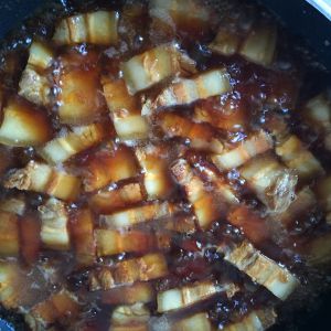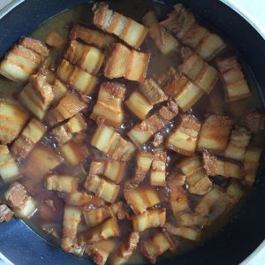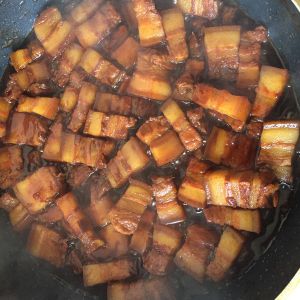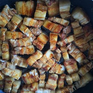 加入少量盐,酱油三大调羹,老抽一调羹,拌匀后加入一大碗水,最好是上汤,没有的话热开水。要没过猪肉。小火慢炖十五分钟左右。如果是土猪肉需要炖更久一点,普通猪肉的话十分钟左右就可以了。
