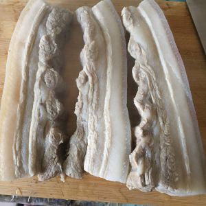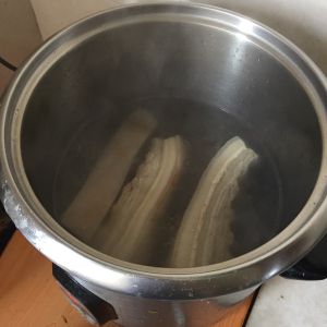 五花肉一整条冷水下锅,放入姜片,水开后,转小火定时五十分钟左右。