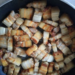 烧锅倒油,加入冰糖碎。待糖融化加入猪肉,转小火。