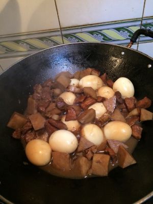 五花肉是我提前卤好的。五花肉焯水厚加入卤肉包煮熟即可。切成稍大点的肉块备用