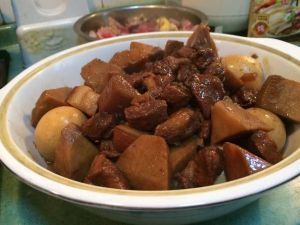 再放入肉块翻炒至颜色微焦(将猪肉内的油脂炒出,可以让猪肉吃起来肥而不腻)