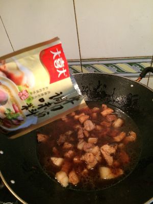 放入肉块翻炒均匀,加入姜,蒜,八角,香叶,生抽,老抽,料酒,加入开水没过肉块。