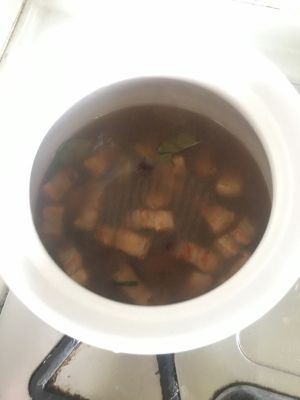 加入没过肉块的热水移至砂锅,大火煮开,转小火煮30分钟,加入适量盐再煮20分钟,煮至汤汁变少的时候换入炒锅。