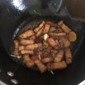 锅里放少量油,炸香所有配料,下五花肉整颗的葱,煸炒至出油,加老抽,六月鲜,黄酒,醋,水,加盖焖至肉块稍烂,以筷子可戳穿为准!