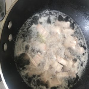 3. 炒锅内放水加入姜片,下入五花肉煮沸后捞出用热水洗净备用。