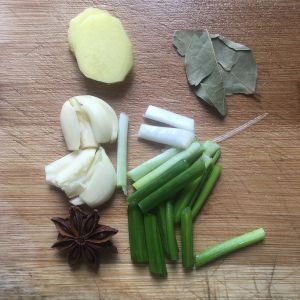 4. 准备八角一颗,香叶两片,大蒜两颗,葱姜少许。