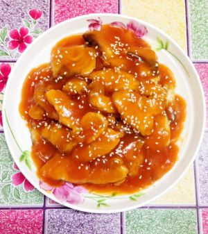 将番茄酱,合水放入小碗中,可加一小点盐,调散,淀粉合水装入碗中调散,锅里加少量油,烧热后加入番茄酱水碗,沸腾后再加入水淀粉。同方向搅拌!结成晶装后,可淋在煎好的鱼块上!