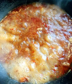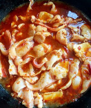锅内少许油烧热加郫县豆瓣酱或“好人家”水煮鱼底料炒香。
