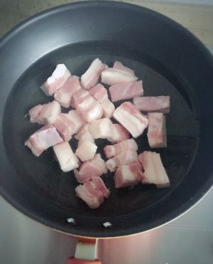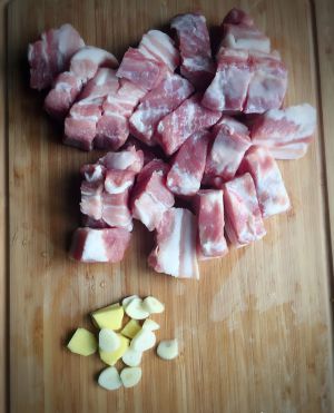 一斤五花肉。冷水下锅,加入生姜料酒煮开在煮10分钟。捞出切成1-2㎝的长方体。