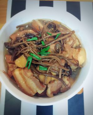 出锅。撒上葱。。美味的茶树菇红烧肉就完成了。全程不用油。不油腻。超美味哦。