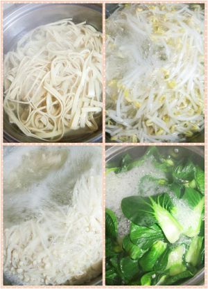 把小青菜,豆腐皮,豆芽,金针菇,过开水煮熟,铺入砂锅锅底。