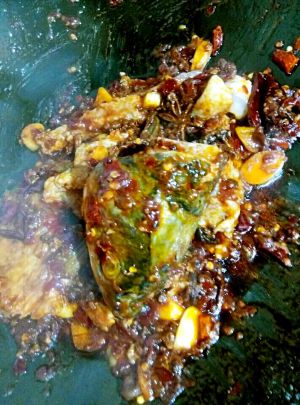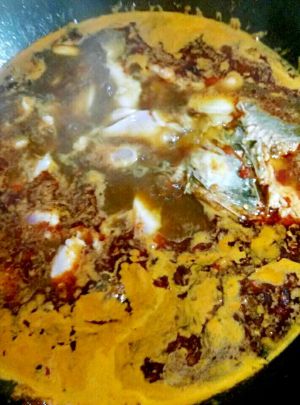 加入2勺豆瓣酱,翻炒鱼头和鱼尾。