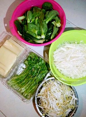 小青菜,豆腐皮,豆芽,金针菇,香菜洗净,为了洗的干净一些我就用盐水泡了一下。
