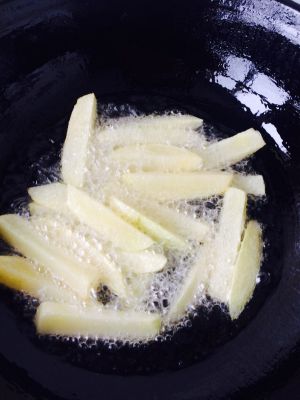 第一,把虾头和虾线剔出,用盐腌制15分钟,炸熟