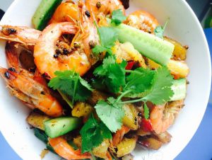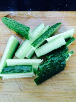 把虾和土豆放进去一炒,再放些盐和调料,最后快出锅的时候放入黄瓜,装盘,出锅
