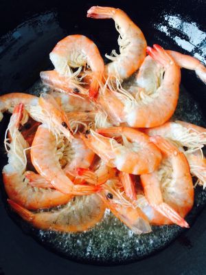 放虾炸黄,放凋味品,少量水,收汁,放葱起锅。