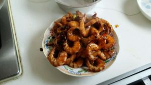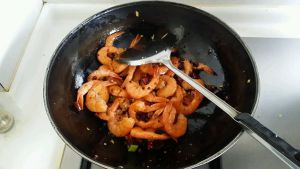 倒入青虾翻炒,加入老抽翻炒,出锅时候倒入适量白糖上色。差不多了就放适量放盐出锅装盘。