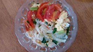 将煮好的白玉翡翠鸡蛋面汤盛出,浇在面条上面,吃之前搅拌一下,面条更入味。