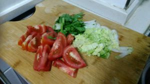 蔬菜洗净,番茄切块,芹菜切段,娃娃菜切丝备用