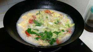 往煎好的小蛋饼加水,烧开后放入切好的番茄、芹菜、娃娃菜,菜煮熟后加盐、酱油调味。