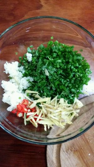 准备好香菜、葱花、蒜蓉,姜丝,辣椒。