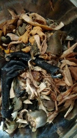 鸡煮好后捞出来凉一会儿,撕成鸡丝(鸡脚最好煮之前就切块煮好就比较难切了,失误)。