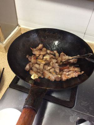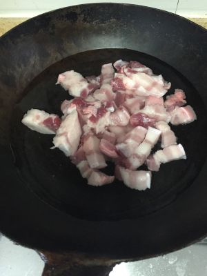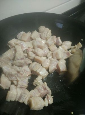 热锅凉油,放入准备好的五花肉,煸炒到微微的金黄色