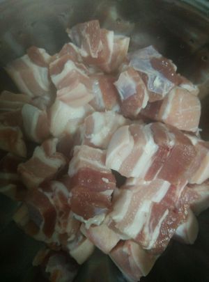 锅上做水,把肉焯一下,然后捞出,洗净,切成一厘米见方的小块儿。