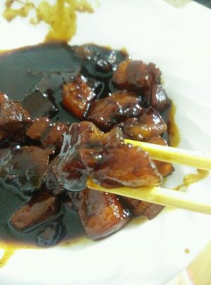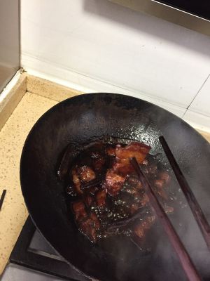 依各人火力情况炖至40分钟左右(期间注意锅里是否烧干是否需加水),用筷子可以轻易捅进肉里就可以收汁起锅(记得要把汤汁收干一些才能糯软香甜的感觉哦