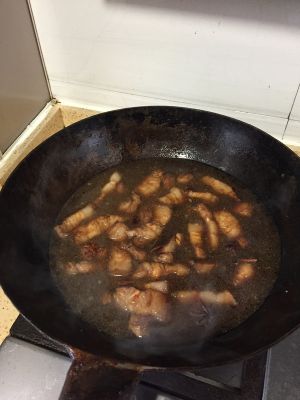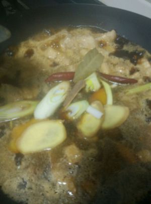 炒锅放油,葱姜大料炝锅,爆香,将切好的肉倒入锅中,同时下入料酒,酱油,老抽,加入水,没过肉即可,盖好锅盖,炖制肉软烂。