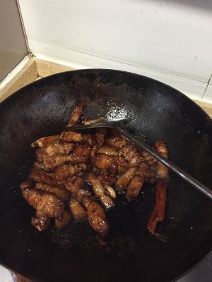 加入料酒,生抽,老抽,不断翻炒以防粘锅