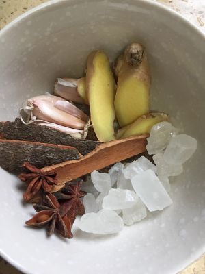 五花肉切块,半棵葱切段,姜拍扁,调料球里放花椒,小茴香,大料1个,肉蔻1个,丁香2个,陈皮3-4根