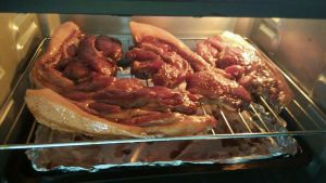 第二天就把它放进烤箱里,220分钟上下火烤20分钟,20分钟过后,用叉烧酱和蜜糖调成酱汁涂在肉上,下火烤5分钟,5分钟过后,再反过来涂上酱汁,下火烤5分钟。。噔噔噔噔~香喷喷的蜜汁叉烧出炉了