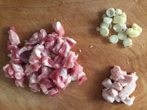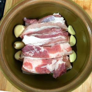 五花肉洗干净切段,沥干水,蒜瓣6颗