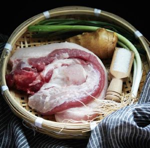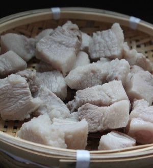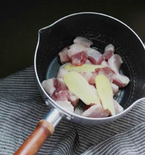肉切大块先用凉水泡一会。肉切大块点,至少2指头宽,肉用上等五花肉,层数越多越好,用凉水泡一5~10分钟左右,放一勺料酒,去腥味,千万别泡久,泡久了就没肉味了。建议一次多买点肉,反正烧1斤肉也是,3斤肉也是烧,不如多烧点,要不还浪费煤气,现在都金融风暴了,多做点多吃两顿多好。不过我只买了一斤肉,就我一个人吃,唉寂寞啊。