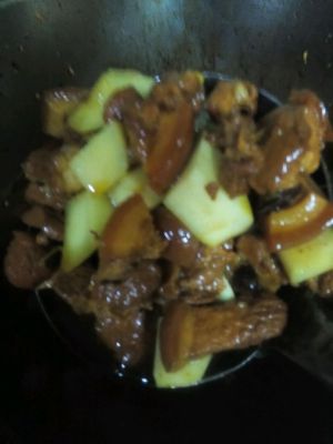 肉八分熟,加入适量热水,把土豆放入,炖十分钟,大火收汁