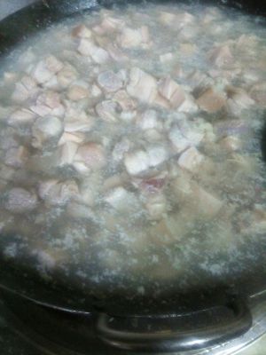 然后炜汤,大火烧滚,小火慢炖,放入调料:盐,味精(等肉出锅才放,鸡粉,胡椒粉少许