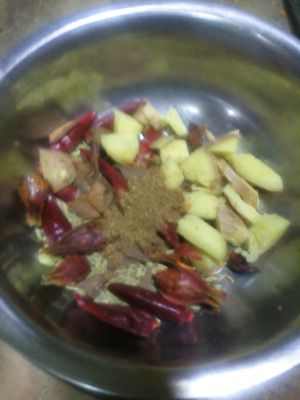 准备大料:干辣椒,小茴香,八角,花椒粉(个人感觉放花椒粒影响成菜,所以放花椒粉),桂皮(掰成小片),丁香(2~3粒),香叶(3~4片),良姜,生姜块