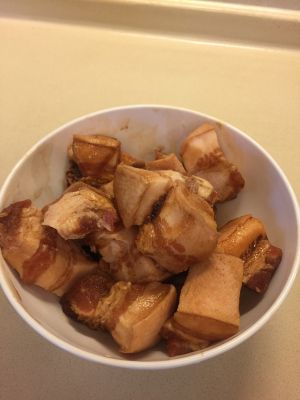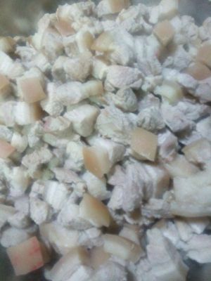 买精五花肉,切成大块,放入料酒去腥加少许酱油或不加